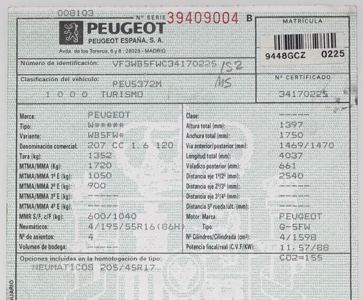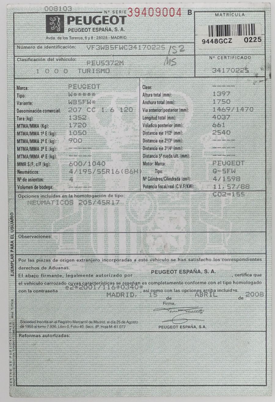 Peugeot 207 1.6i C.C 120 CV Sport. Año 04/2008. Climatizador, ABS, ESP, 4 Airbags, Dirección Asistida, Radio-CD con Mandos en el Volante, Bluetooth, 4 Elevalunas Eléctricos, Cierre Centralizad con Mando, Ordenador de Viaje, Llantas, Faros Antiniebla, Retrovisores Eléctricos. Muy Buen Estado. Pocos Kms.