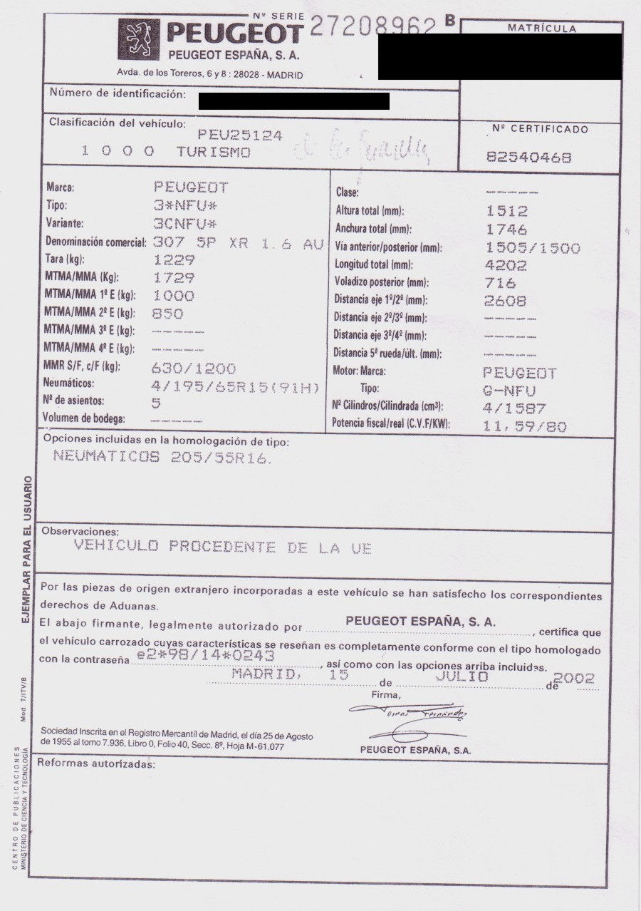 307 1.6i XR, 110 CV, AUTOMATICO/TIPTRONIC.