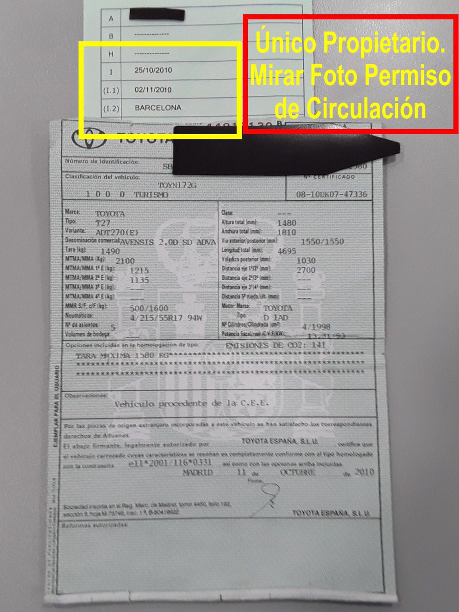 Toyota Avensis 2.0 D-4D Advance 125 CV. Año 25/10/2010. Color Blanco. Climatizador Bi-Zona, ABS, ESP, 8 Airbags, Sistema de navegación: DVD-Navegador con pantalla táctil en color "Toyota", 4 Elevalunas Eléctricos, Cierre Centralizado con Mando con apertura y arranque "Sin Llave", Retrovisores Eléctricos y retractiles, Radio/CD, MP3, Aux, USB, Bluetooth Original Toyota, Faros Antiniebla, Volante de Cuero Multifuncional, Control y Limitador de Velocidad, Apoyabrazos Centrales, Sensor de Parking Trasero, Llantas, Dirección Asistida, Programa electrónico de estabilidad con Regulación antideslizante (VSC con TRC), Muy Buen Estado