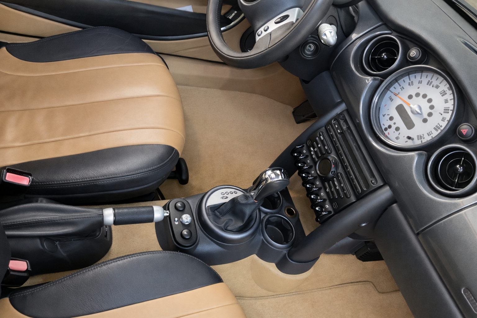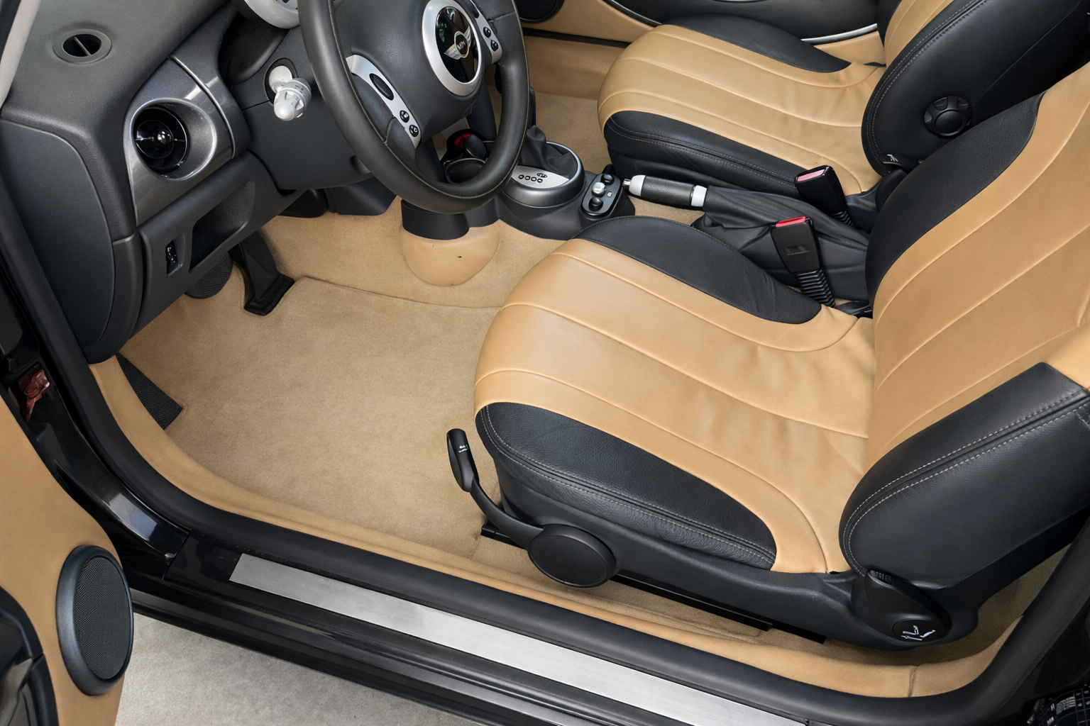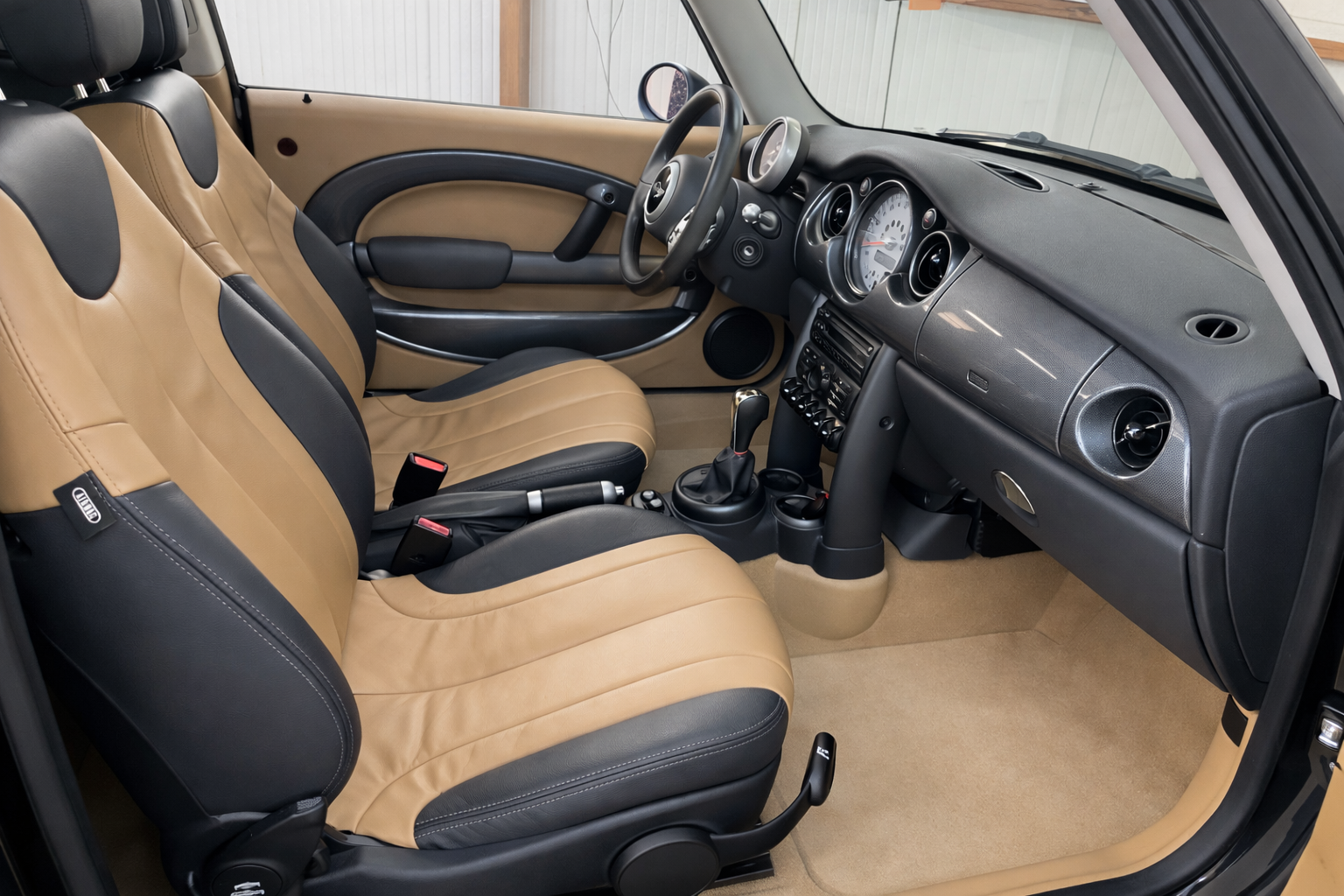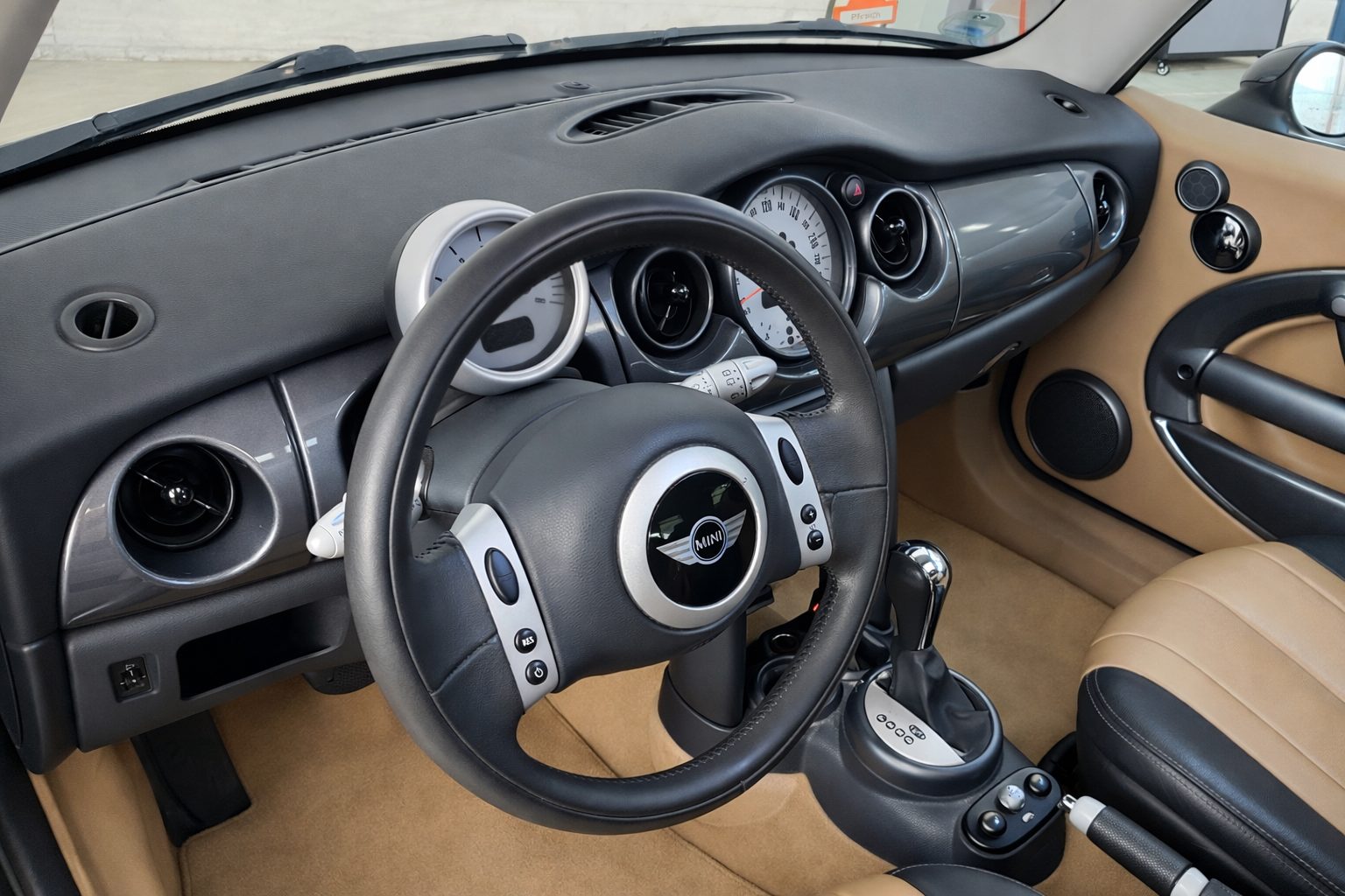 Mini Cooper 1.6i 115 CV Automatico/Sec 6 Velocidades. Color Negro Metalizado. Año 04/04/2003. Climatizador automático, Asientos de Cuero Beige con Calefacción, Llantas 15", Dirección Asistida, Techo Solar Panorámico Eléctrico, Ordenador de Viaje, Elevalunas Eléctricos, Cierre Centralizado con Mando, Volante de Cuero, Sistema antibloqueo de frenos (ABS), 6 Airbags, Retrovisor interior con sistema antideslumbramiento automatico, Asiento delante derecha regulable en altura, Luces antiniebla, Respaldo del asiento trasero dividido/abatible, Mando a distancia para Cierre centralizado, Retrovisor exterior regulable eléctricamente, Automático control-estabilidad y tracción (ASC + T), Limpiaparabrisas con Sensor de lluvia, Acabado exterior: cromado Line. Muy Equipado.