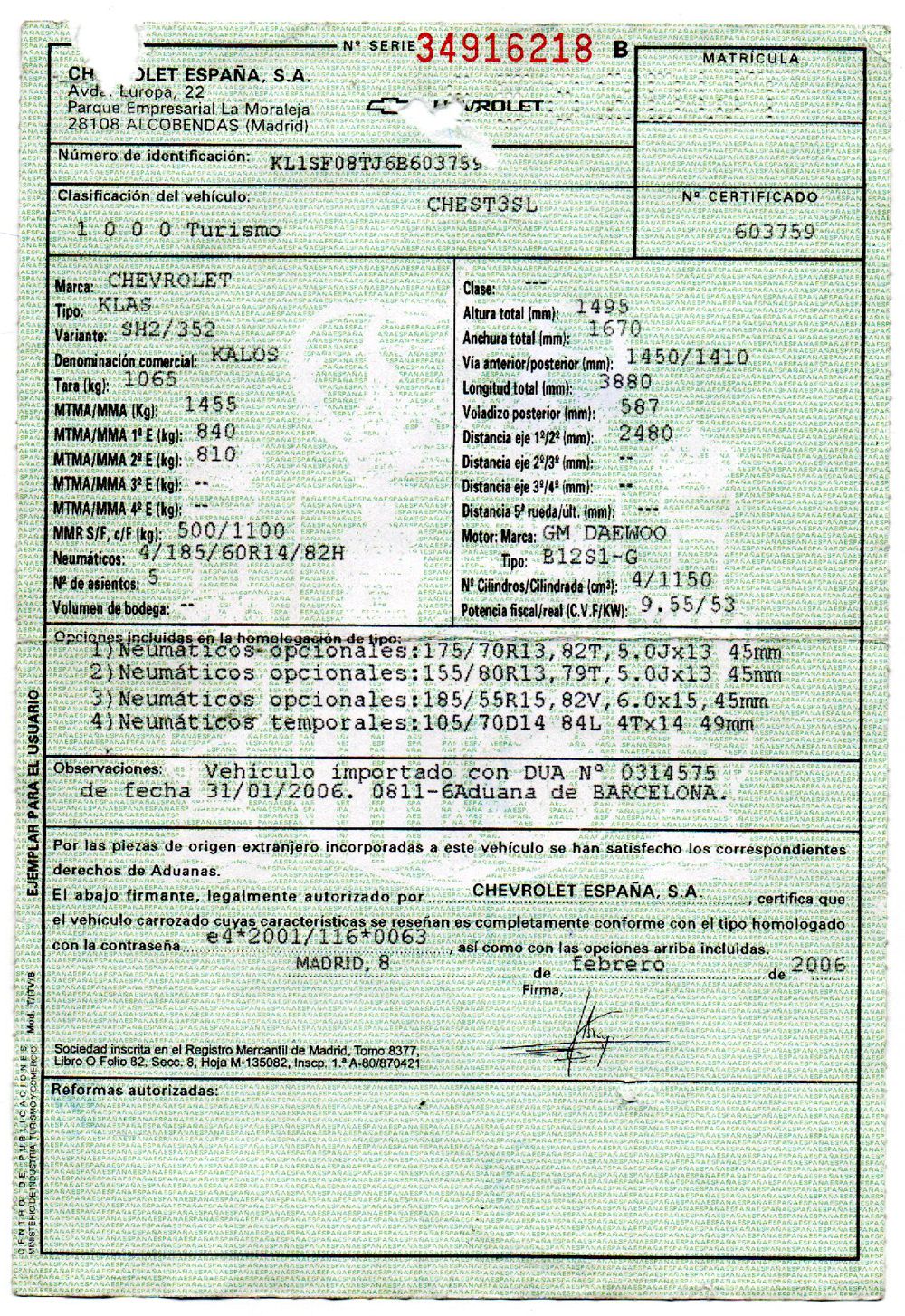 Bastidor: KL1SF08TJ6B603759