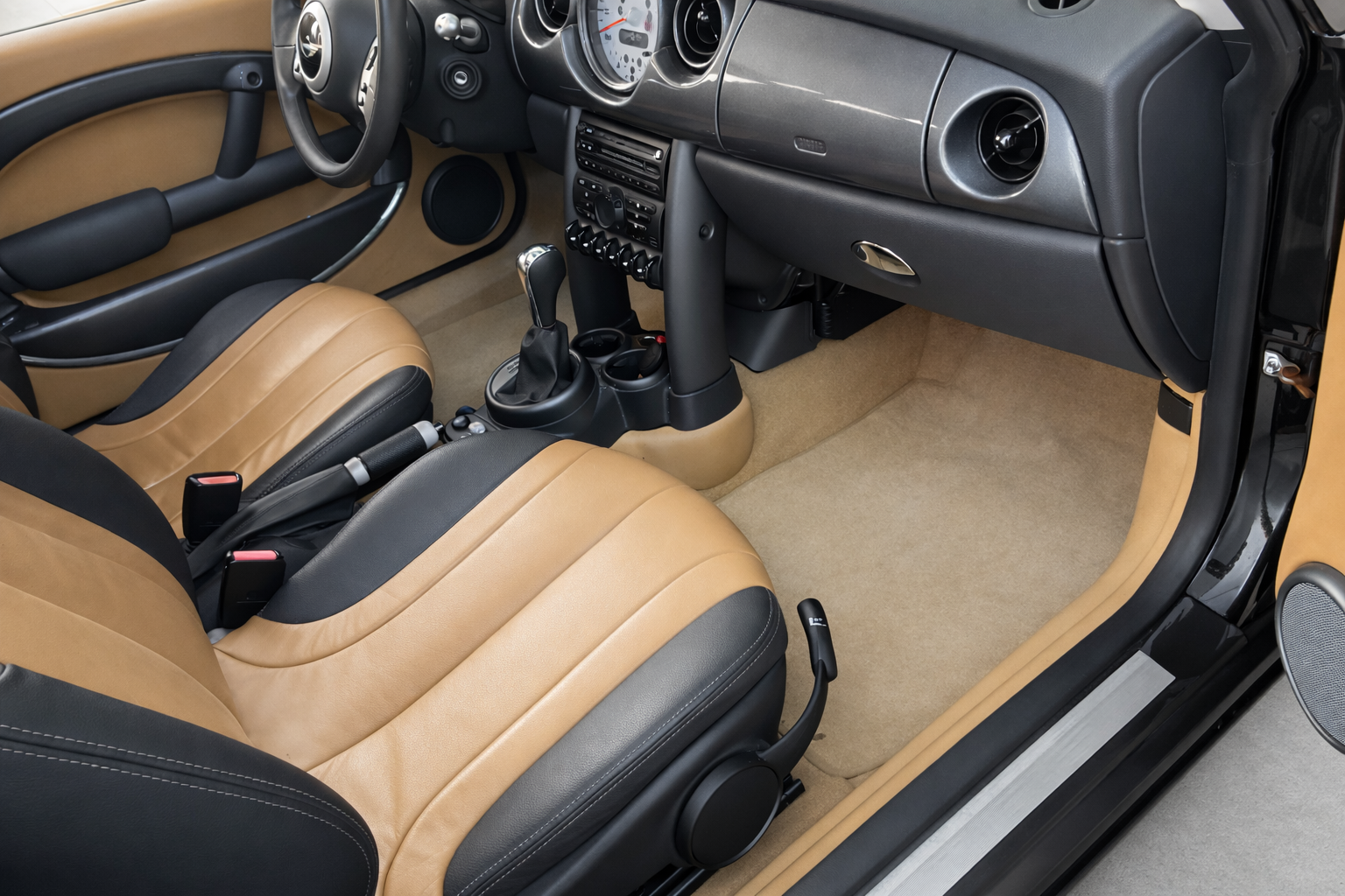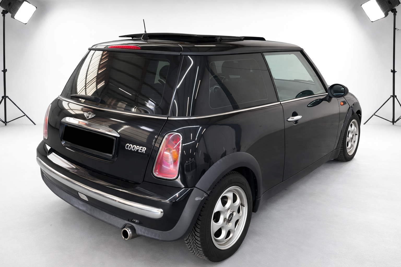 Mini Cooper 1.6i 115 CV Automatico/Sec 6 Velocidades. Color Negro Metalizado. Año 04/04/2003. Climatizador automático, Asientos de Cuero Beige con Calefacción, Llantas 15", Dirección Asistida, Techo Solar Panorámico Eléctrico, Ordenador de Viaje, Elevalunas Eléctricos, Cierre Centralizado con Mando, Volante de Cuero, Sistema antibloqueo de frenos (ABS), 6 Airbags, Retrovisor interior con sistema antideslumbramiento automatico, Asiento delante derecha regulable en altura, Luces antiniebla, Respaldo del asiento trasero dividido/abatible, Mando a distancia para Cierre centralizado, Retrovisor exterior regulable eléctricamente, Automático control-estabilidad y tracción (ASC + T), Limpiaparabrisas con Sensor de lluvia, Acabado exterior: cromado Line. Muy Equipado.
